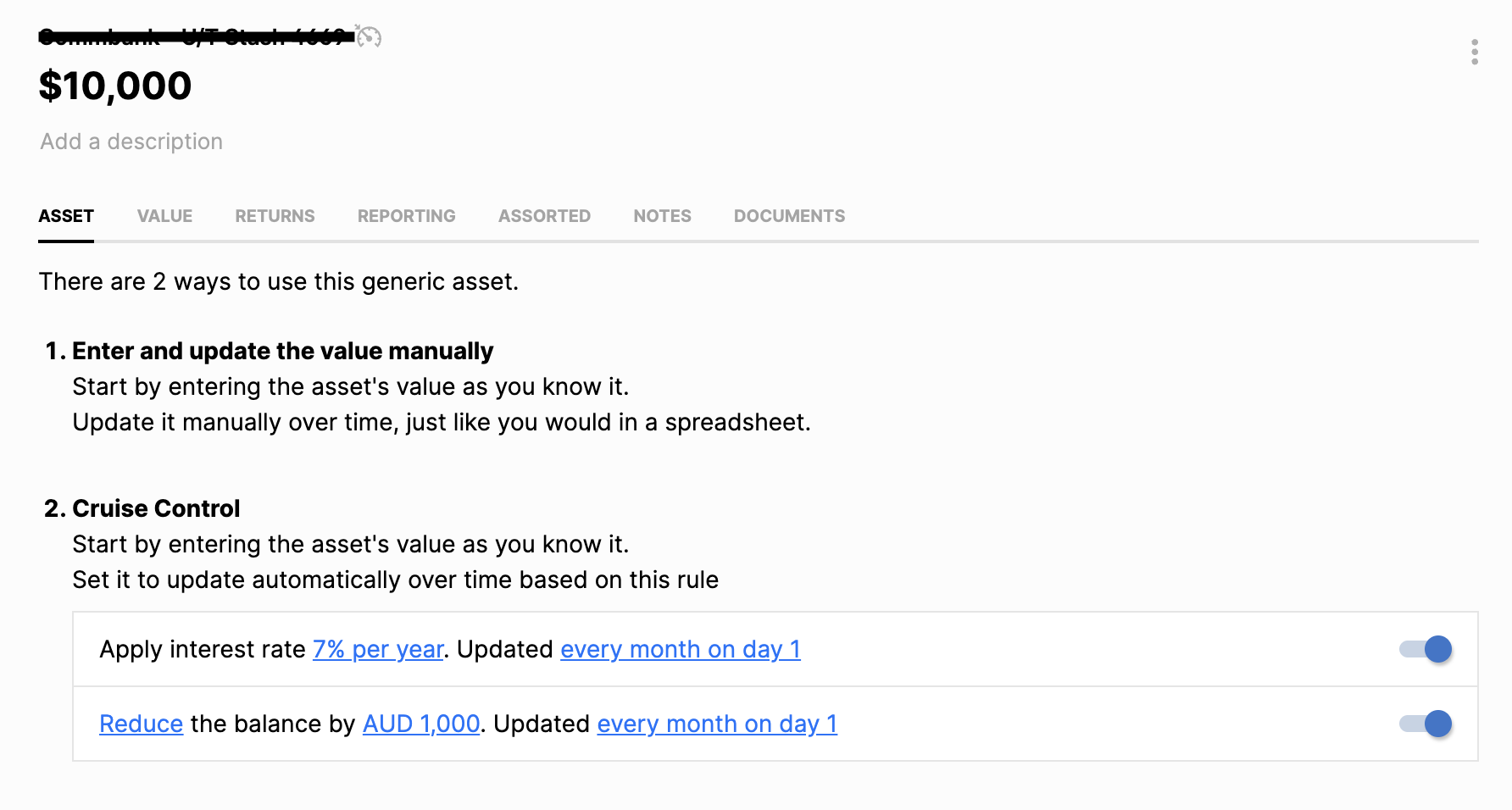 If there's a regular payment coming to you, you may use the Cruise Control feature to automatically update the value with an interest rate every month and then reduce the balance using regular payment amount that comes to you.