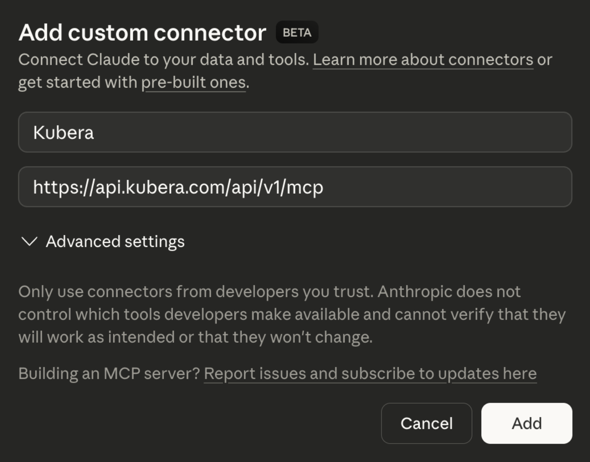 Name: Kubera Remote MCP Server URL: https://api.kubera.com/api/v1/mcp Click Add